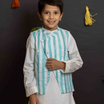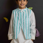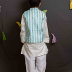 Striped Mirror Work Bundi with cotton lining, all-over mirror embellishments, mandarin collar, and an asymmetric front opening for a contemporary touch.