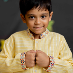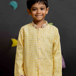 Pastel Yellow Kurta in cotton lurex with cotton lining, featuring a mandarin collar, full front opening, and delicate embroidery on the collar and sleeve ends.