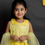 Yellow Net Dupatta adorned with silver gota lace to complete the coordinated festive look.