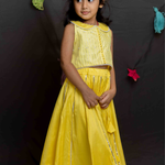 Yellow Lehenga in cotton santoon and organza with cotton lining, featuring a drawstring waist, kalis, silver gota detailing, and pearl work lace at the hem.