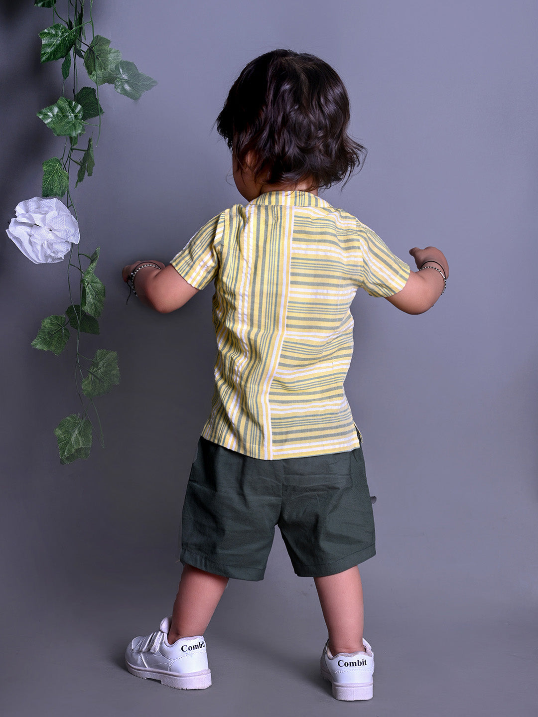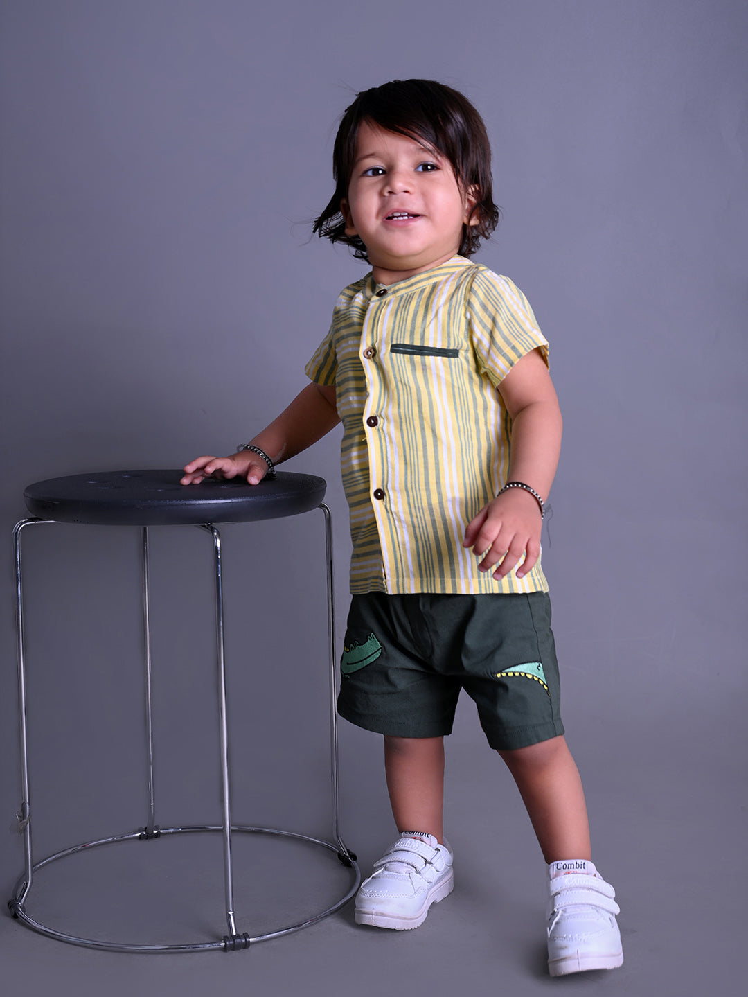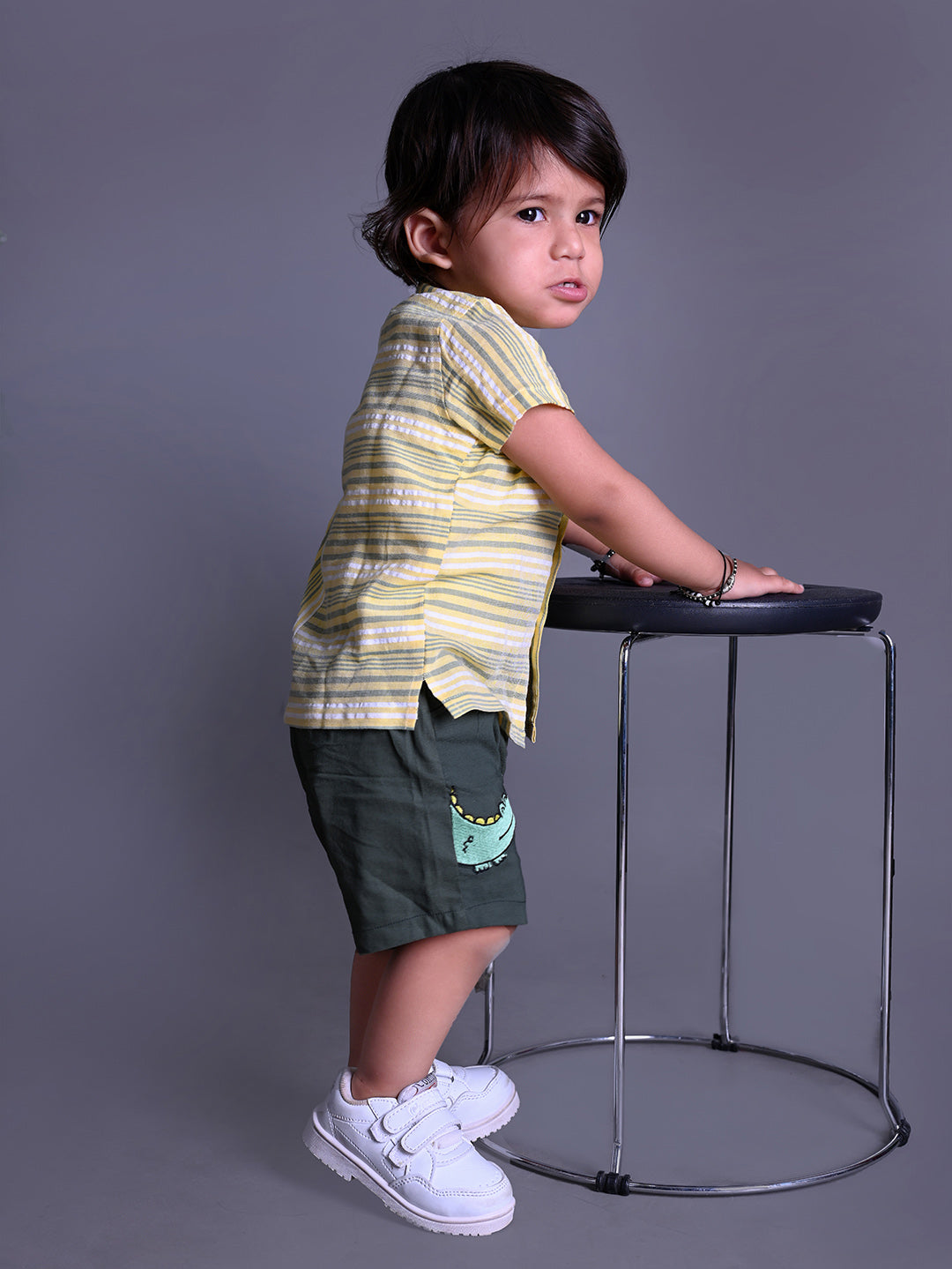 Dress your baby boy in our charming Yellow Stripes Croc Shorts Set. Crafted from pure cotton, this set combines playful details with elegant design elements to create an adorable and comfortable outfit for any occasion.