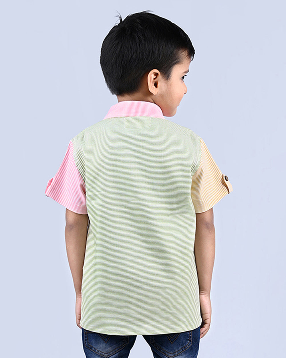 - Vibrant Multi-Colored Stripes: Shirt adorned with lively yellow and green horizontal stripes on the front and back, complemented by a playful pink striped collar and sleeve.